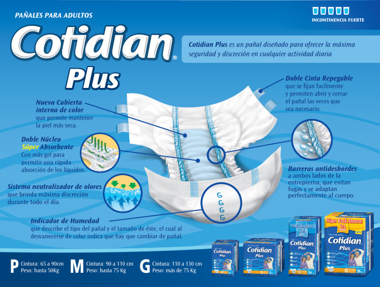 Pañales para adultos para incontinencia fuerte. Cotidian Plus tiene doble nucleo absorbente, doble cinta replegable, es hipoalergénico , cuenta con indicador de humedad y suaviza olores.